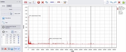 In this case, vibration analysis was applied to a bearing in a CNC spindle and the following were identified: the failure frequencies of each of its components. These include the inner race, the outer race, the cage, and the rolling element. Each component has a specific vibration signature. When damage occurs, that signature becomes visible in the spectrum. In the case analyzed, the most significant damage is present in the rolling element. This is seen clearly in the following image.