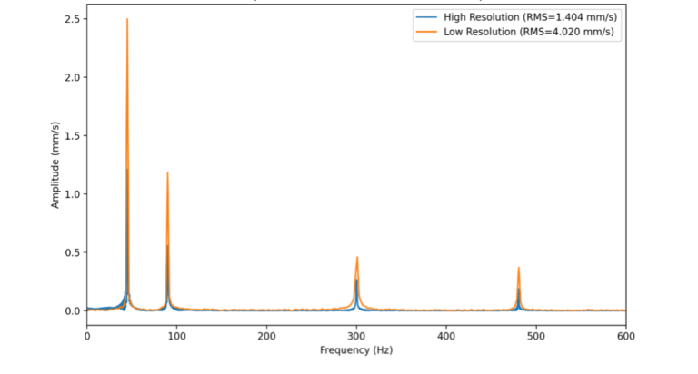 Consider two analyzers measuring up to 5 kHz. One uses 3,200 lines of resolution, while another uses only 800. The second analyzer has bins four times wider, so a vibration peak that does not fall exactly in the center of a bin becomes smeared, causing its measured amplitude to drop significantly.