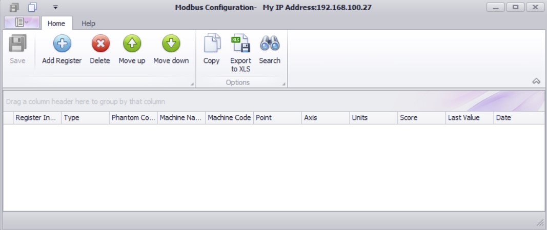 The Register option will let you get post processing data from the gateway including Envelope Acceleration and detailed RMS data. To configurate this option fist click on “Register” from the Modbus menu and the Modbus configuration window will open.