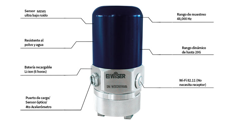 WiSER 3x es un Acelerómetro Inalámbrico de 3 ejes especialmente diseñado para el análisis de vibraciones, compatible con cualquier analizador de vibraciones disponible en el mercado. WiSER 3x envía datos de vibración de 3 ejes + 1 canal adicional de forma simultánea. Además, WiSER 3x es un acelerómetro inalámbrico de ultra bajo ruido con un ancho de banda de 10 kHz que supera las características de la mayoría de los acelerómetros convencionales.